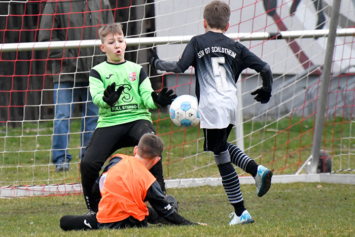 Spielerisch ging es aber sogleich zur Sache. Bereits nach 5 Minuten eine große Verwirrung vor dem Tor des SSV 07 Schlotheim, bis sich Marek doch
